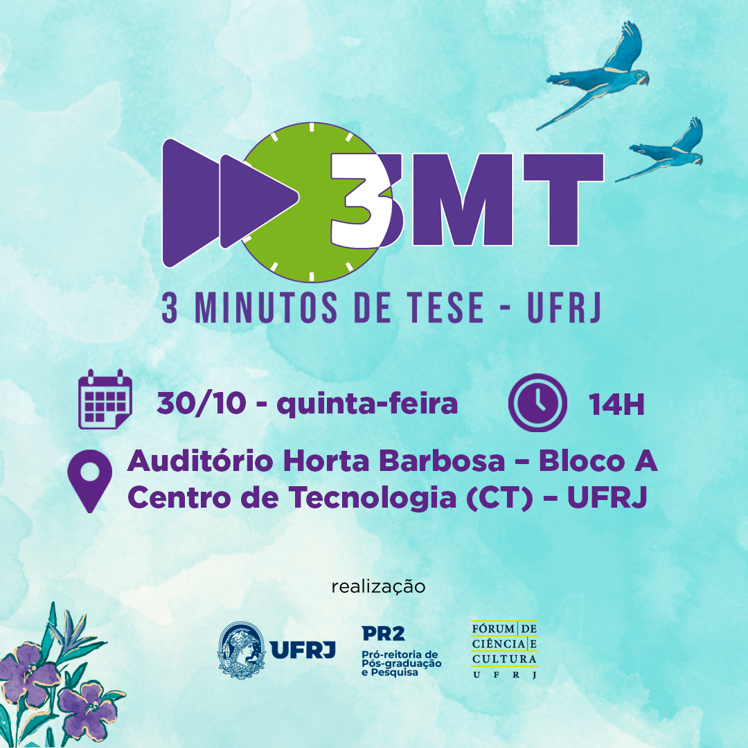 É com grande satisfação que convidamos você para a grande final do concurso 3 Minutos de Tese da UFRJ, que ocorrerá no dia 30 de outubro (quinta-feira), às 14h, no Auditório Horta Barbosa – Bloco A – Centro de Tecnologia da UFRJ ( Av. Athos da Silveira Ramos, nº 149, Cidade Universitária – Fundão).